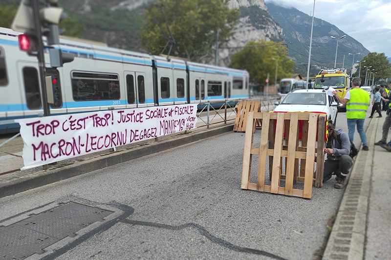 Le 10 septembre au matin, un barrage filtrant était mis en place au niveau du terminus de tram, la Poya dès 6h30. Une demi-heure plus tard plus de 50 militants étaient présents. Habillés de chasubles Solidaires, CGT, de gilets jaunes, les militants· PCF, LFI, NPA, libertaires, non engagés, distribuaient des tracts. Beaucoup de jeunes. Les automobilistes ralentis par les filtres mis en place accueillaient en général avec sympathie les tracts appelant notamment à la manifestation de l’après-midi. Un jeune chauffeur lisant le tract, en attendant que la voiture puisse passer, l’admet : « Vous m’avez convaincu, je n’irai pas travailler aujourd’hui. Je manifesterai avec vous. » L’attestation de retard/absence a été accueillie avec des sourires.