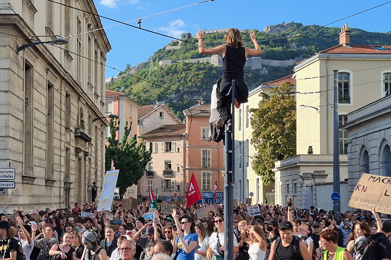 Debout dans l’escalier menant à la gare de départ des « bulles », derrière le Jardin de ville, Cécile contemple le flot de manifestants s’étirant à perte de vue le long des quais de l’Isère, ce mercredi 10 septembre. Alors que la banderole de tête arrive à sa hauteur, une partie du cortège n’a toujours pas quitté le point de départ, place Victor-Hugo. Entre les organisateurs, les estimations diffèrent : 15 000, 20 000, 30 000… Une chose est sûre, la mobilisation est massive, une réussite pour le mouvement « Bloquons tout ». L’infirmière, elle, savoure le joli pied de nez adressé « à tous ces chroniqueurs et éditorialistes qui prédisaient un flop au 10 septembre ».