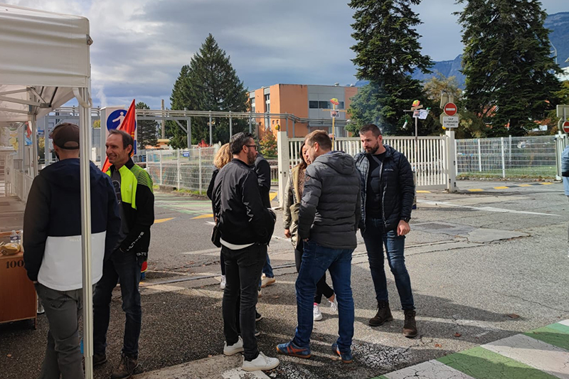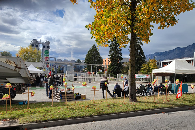 Ils sont assis sur des chaises de jardin installées devant l’entrée du site, profitant d’un coin de ciel bleu bienvenu, ce mardi 20 octobre, après la pluie de la veille. Mais l’atmosphère — plutôt détendue en apparence — sur le piquet de grève est trompeuse. Les sourires sont timides, tous ont le cœur lourd. Jeudi 16 octobre, les salariés de Teisseire, alors en grève depuis une semaine, ont en effet appris, à l’occasion d’un CSE extraordinaire, la fermeture de l’usine de Crolles, prévue au printemps 2026.