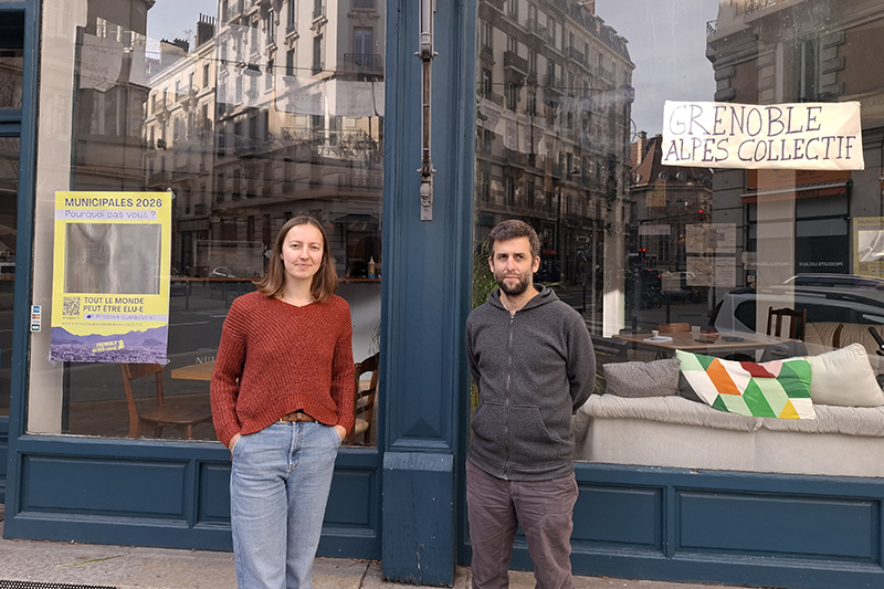 Fabien Givernaud et Léonie Chamussy, membres du GAC, devant le local du collectif, avenue Félix-Viallet, et à côté d'une affiche appelant les Grenoblois à participer au plébiscite.