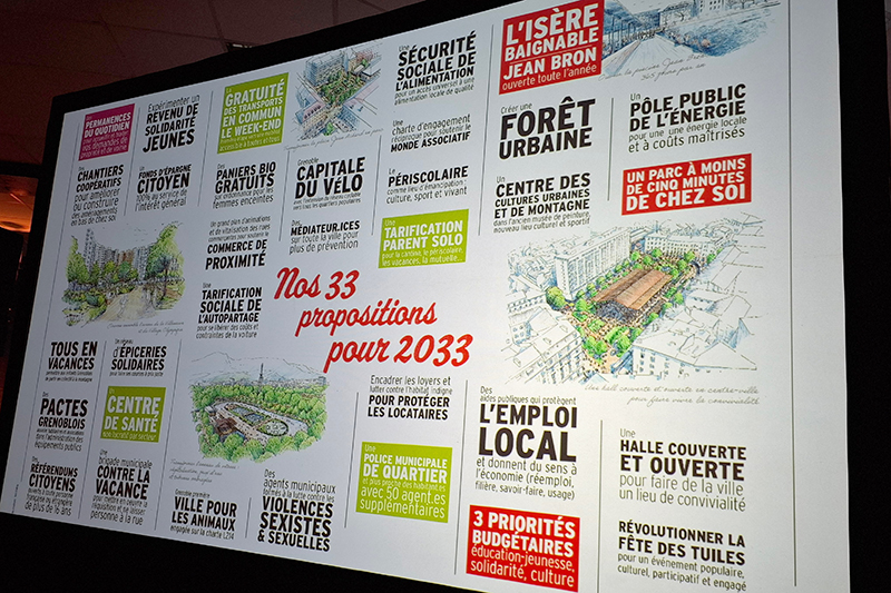 Si Laurence Ruffin n’a pas rendu public l’intégralité de son programme, ses colistiers et colistières, venus la rejoindre sur la tribune, ont tout de même présenté à tour de rôle leurs « 33 propositions pour 2033 ». Parmi ces premières mesures, citons pêle-mêle — outre les trois précitées — l’instauration de référendums citoyens, la gratuité des transports publics le week-end, une tarification « parent solo » pour la cantine, le périscolaire ou la mutuelle, la création d’une forêt urbaine et d’une halle couverte, des paniers bio gratuits pour les femmes enceintes, un programme « tous en vacances » pour les petits Grenoblois qui ne sont jamais partis ou encore une police municipale de quartier avec cinquante agents supplémentaires.
